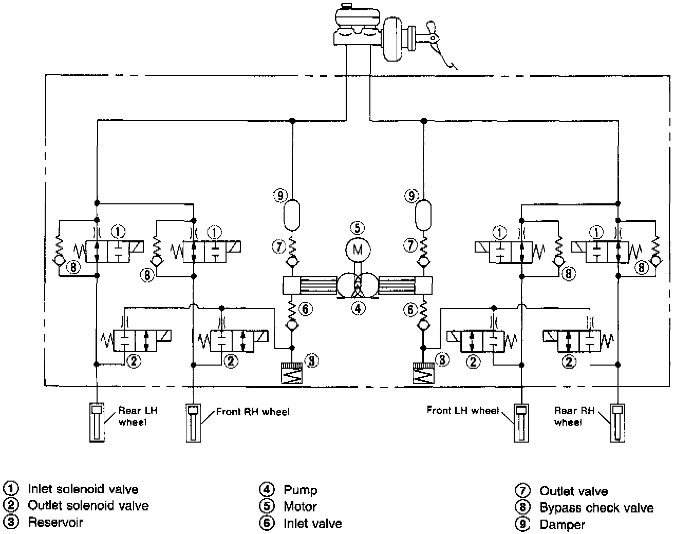 PURPOSEThe Anti-Lock Brake System (ABS) consists of electronic and hydraulic components. It allows for control of braking force so that locking of the wheels can be avoided. The ABS: