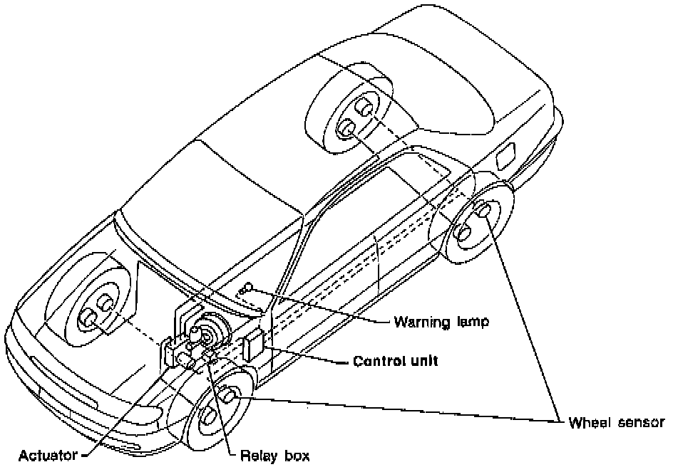 The control unit computes the wheel rotating speed by the signal current sent from the sensor. Then it supplies a DC current to the actuator solenoid valve. It also controls ON-OFF operation of the valve relay and pump relay. If any electrical malfunction should be detected in the system, the control unit causes the warning lamp to light up. In this condition, the ABS will be deactivated by the control unit, and the vehicle's braking system reverts to normal operation.