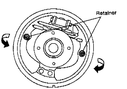 2. Push in shoe hold-down pins from behind the back plate. While pushing in the retainer, turn it and remove the shoe hold-down pins.