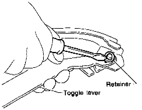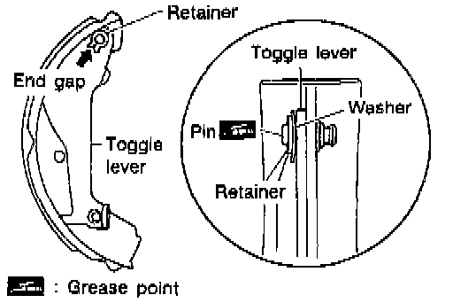 8. Remove retainer ring with a suitable tool. Then separate toggle lever and brake shoe.