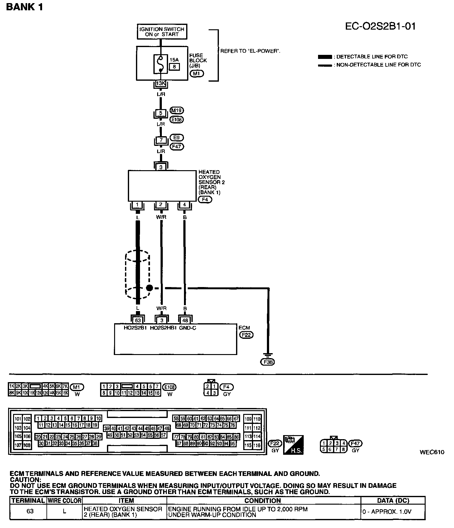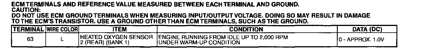 3. Set voltmeter probes between ECM terminals 63 (HO2S2 bank 1) or 95 (HO2S2 bank 2) and engine ground.