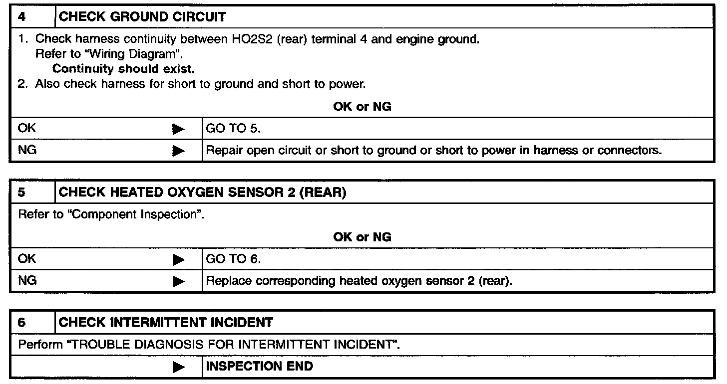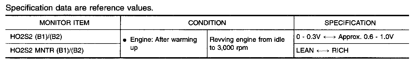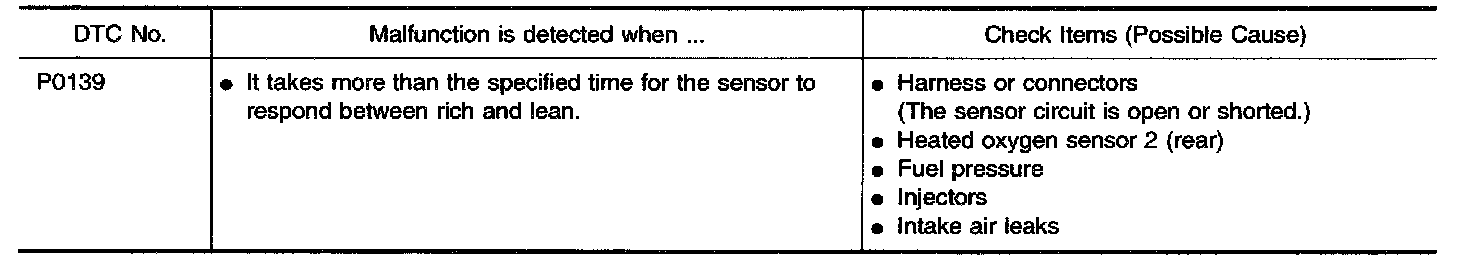The heated oxygen sensor 2 (rear) has a much longer switching time between rich and lean than the heated oxygen sensor 1 (front). The oxygen storage capacity before the three way catalyst causes the longer switching time. To judge the malfunctions of rear heated oxygen sensor, ECM monitors whether the switching response of the sensor's voltage is faster than specified during various driving conditions such as fuel-cut.