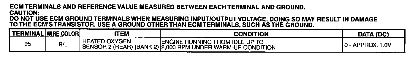 3. Set voltmeter probes between ECM terminals 63 (HO2S2 bank 1) or 95 (HO2S2 bank 2) and engine ground.