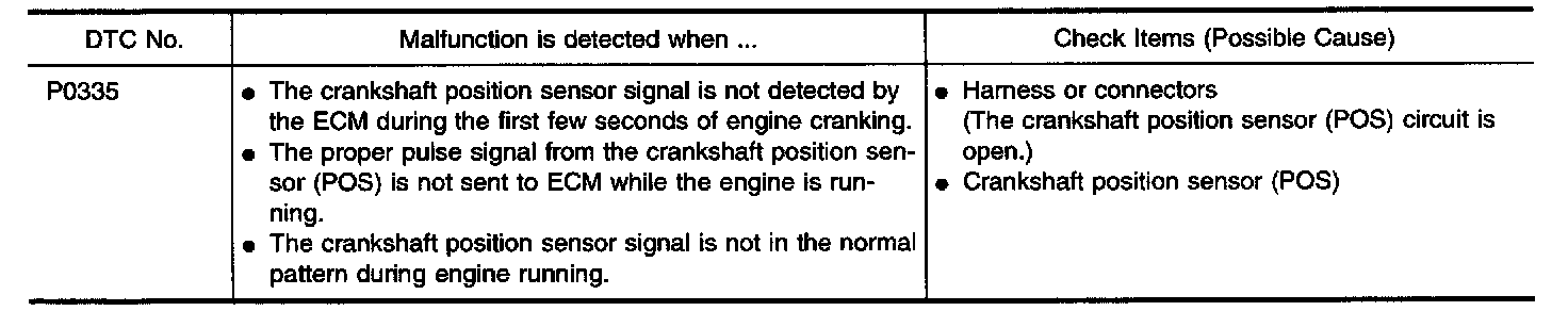 The crankshaft position sensor (POS) is located on the cylinder block rear housing facing the gear teeth (cogs) of the signal plate at the end of the crankshaft. It detects the fluctuation of the engine revolution.
