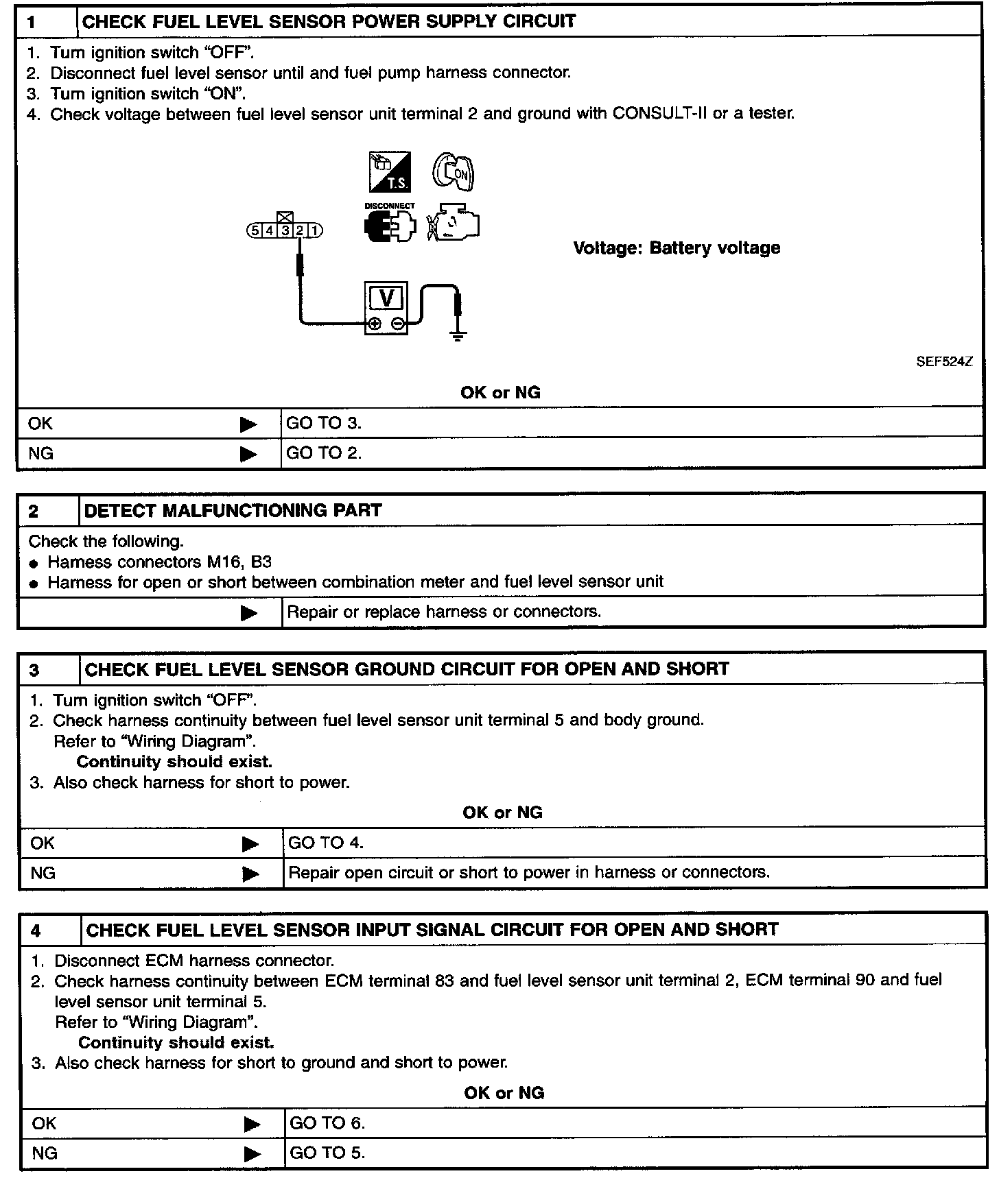 The fuel level sensor is mounted in the fuel level sensor unit. The sensor detects a fuel level in the fuel tank and transmits a signal to the ECM.