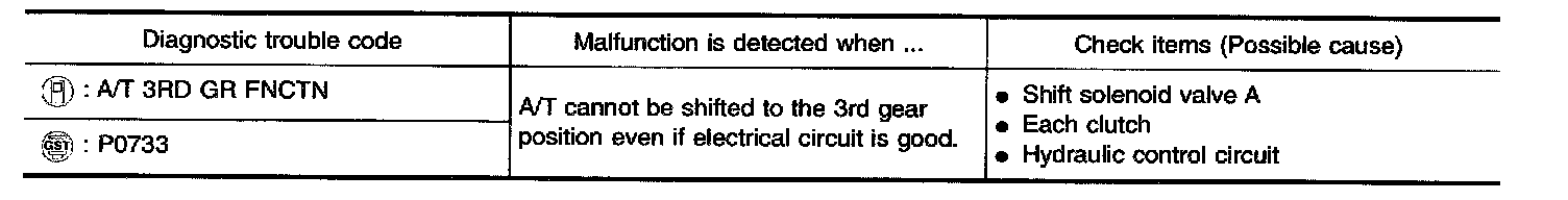 - This malfunction is detected when the A/T does not shift into third gear position as instructed by the TCM. This is not caused by electrical malfunction (circuits open or shorted) but by mechanical malfunction such as control valve sticking, improper solenoid valve operation, malfunctioning servo piston or brake band, etc.