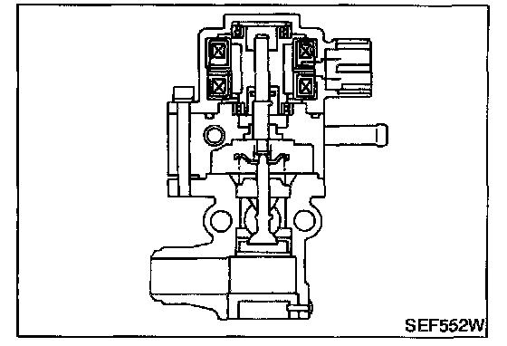 The EGR volume control valve uses a step motor to control the flow rate of EGR from exhaust manifold. This motor has four winding phases. It operates according to the output pulse signal of the ECM. Two windings are turned ON and OFF in sequence. Each time an ON pulse is issued, the valve opens or closes, changing the flow rate. When no change in the flow rate is needed, the ECM does not issue the pulse signal. A certain voltage signal is issued so that the valve remains at that particular opening.