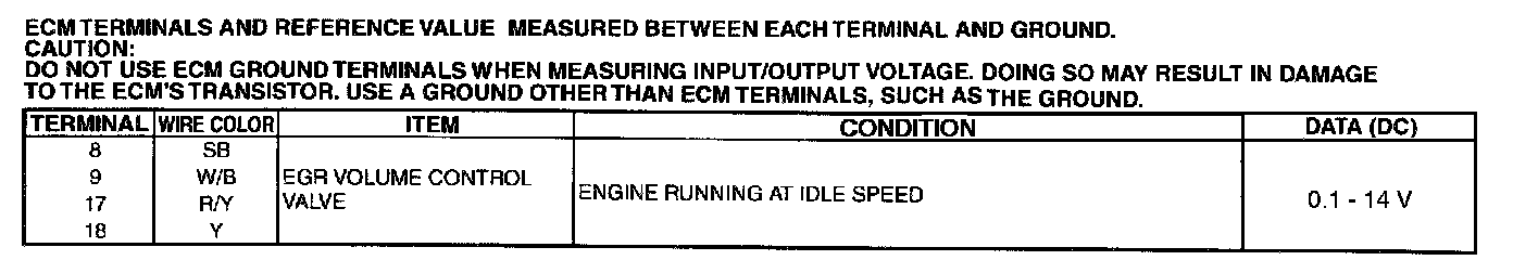 3. Check that voltage between ECM terminal 72 (EGR temperature sensor signal) and ground is less than 4.8 V.