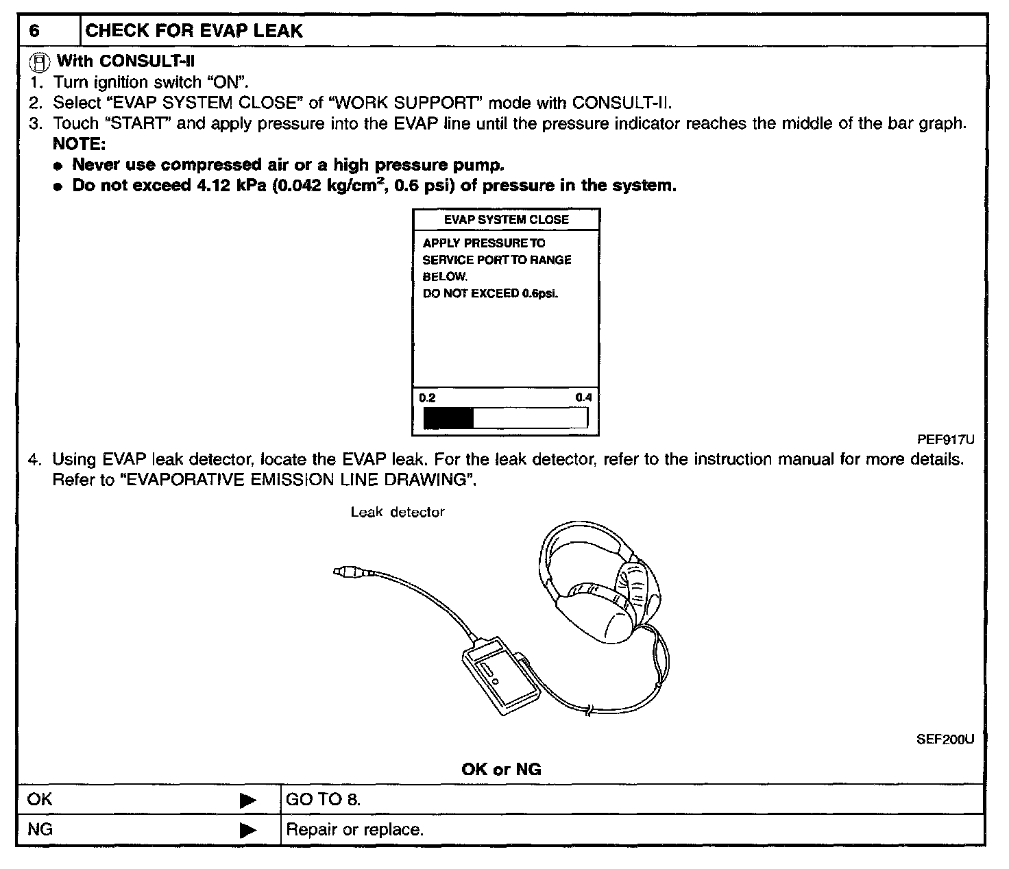 Pressure to be applied: 2.7 kPa (20 mmHg, 0.79 inHg) Time to be waited after the pressure drawn in to the EVAP system and the pressure to be dropped: 60 seconds and the pressure should not be dropped more than 0.4 kPa (3 mmHg, 0.2 inHg).