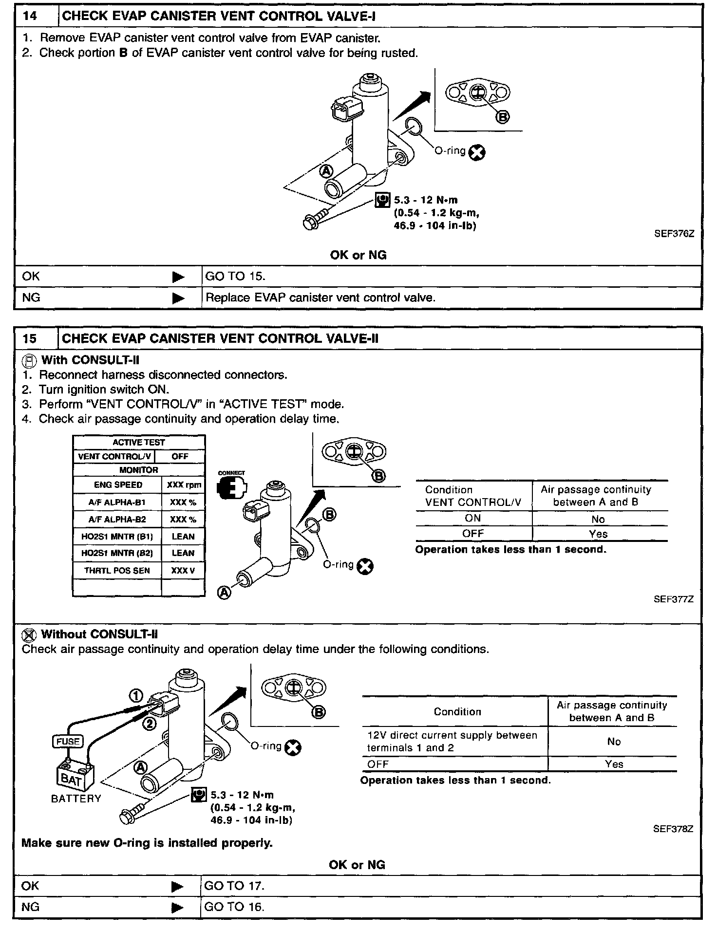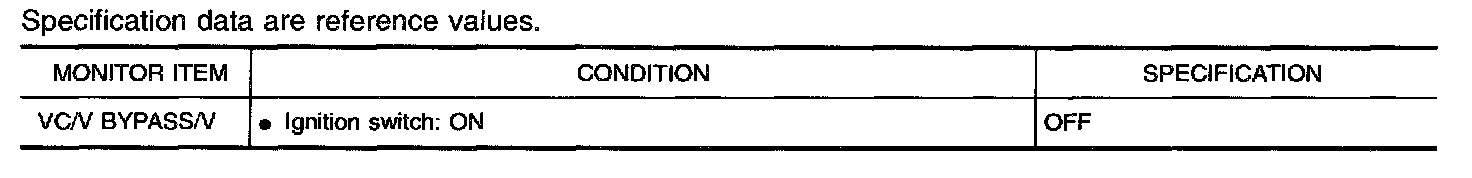 The vacuum cut valve bypass valve is a solenoid type valve and generally remains closed. It opens only for on board diagnosis. The vacuum cut valve bypass valve responds to signals from the ECM. When the ECM sends an ON (ground) signal, the valve is opened. The vacuum cut valve is then bypassed to apply intake manifold vacuum to the fuel tank.