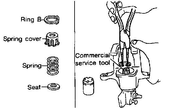 a. Pry off ring B with suitable pliers, then remove spring cover, spring and seat.