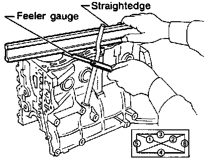 Use a reliable straightedge and feeler gauge to check the flatness of cylinder block surface. Check along six positions shown in figure.