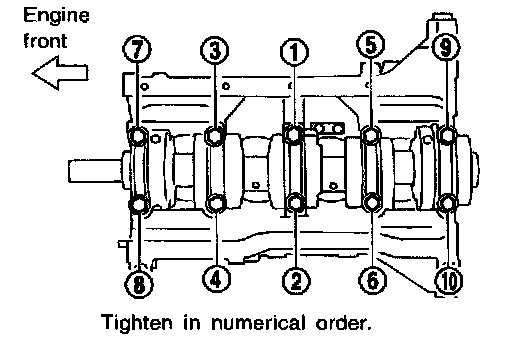 ^ Tighten bearing cap bolts gradually in two or three stages. Start with center bearing and move outward as shown in figure.