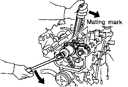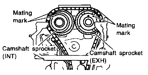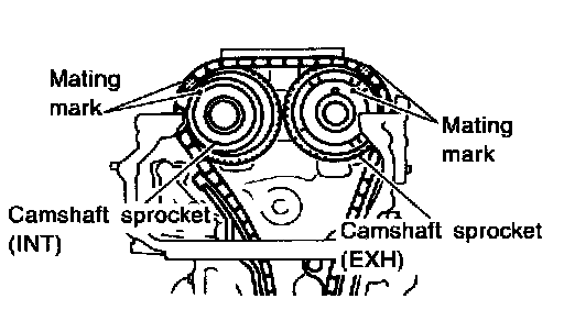 ^ Rotate crankshaft until mating mark on camshaft sprocket is set at position indicated in figure at left.