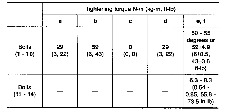 f) Tightening bolts (11 - 14) to 6.3 to 8.3 Nm (0.64 to 0.85 kg-m, 55.8 to 73.5 inch lbs.).