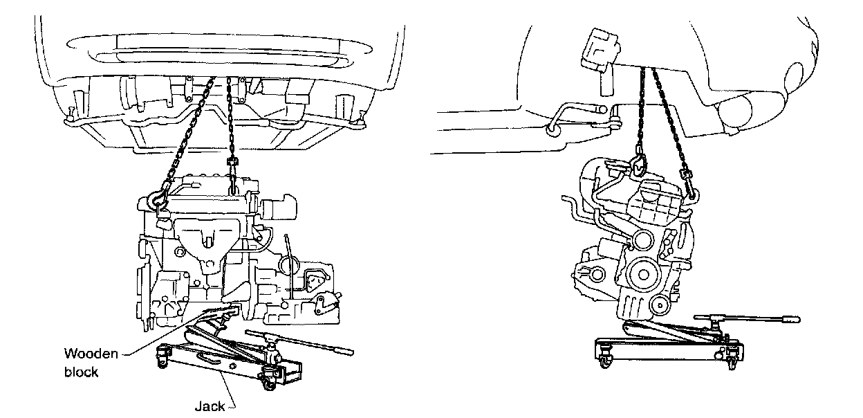 ^ When lifting engine, be sure to clear surrounding parts. Use special care near accelerator wire casing, brake lines and brake master cylinder.