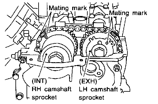 - Rotate crankshaft until mating mark on camshaft sprocket is set at position indicated in figure at left.