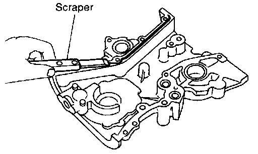 10. Before installing front cover, remove all traces of RTV silicone sealant from mating surface using a scraper.