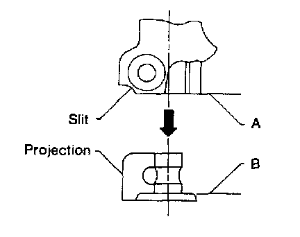 - Align slit of lower joint with projection on dust cover. Insert joint until surface A contacts surface B.