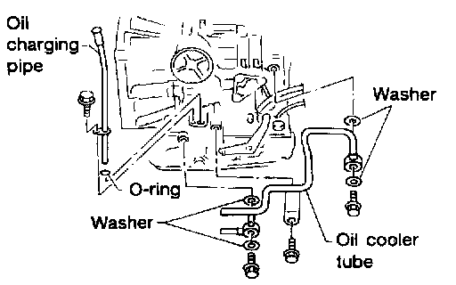 4. Remove oil charging pipe and oil cooler tube.
