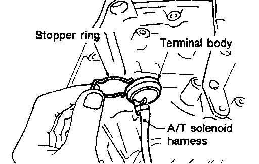 c. Push terminal body into transmission case and draw out solenoid harness.