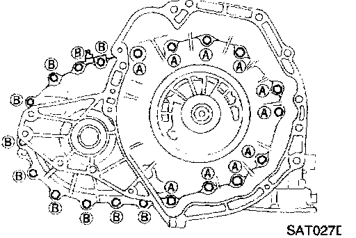 a. Remove converter housing mounting bolts A and B.