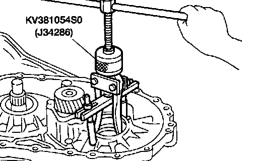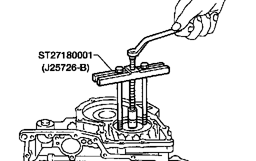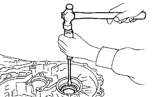 21. Remove differential side bearing outer race from transmission case using Tool.