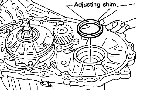 22. Remove differential side bearing adjusting shim from transmission case.