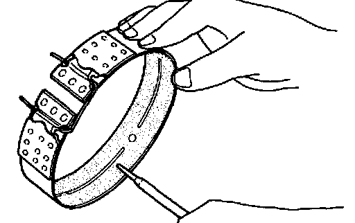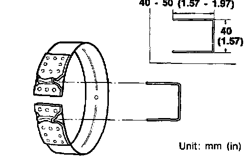 - To prevent brake linings from cracking or peeling, do not stretch the flexible band unnecessarily. When removing the brake band, always secure it with a clip as shown in the figure at left. Leave the clip in position after removing the brake band.