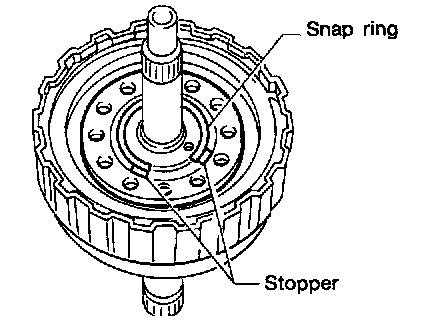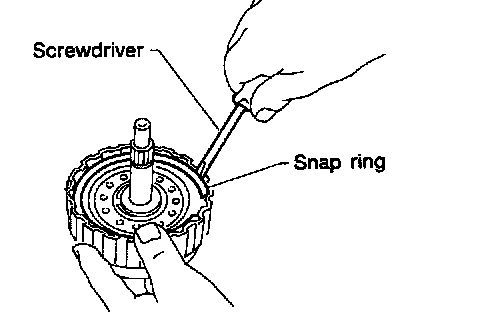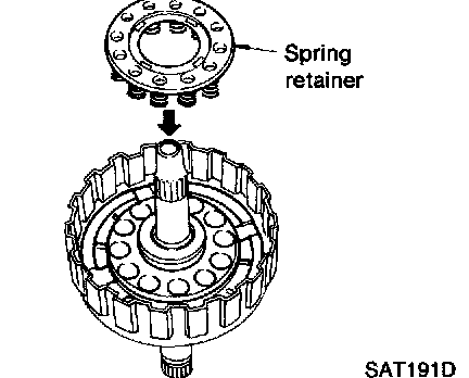 5. Set Tool on spring retainer and remove snap ring from high clutch drum while compressing return springs.