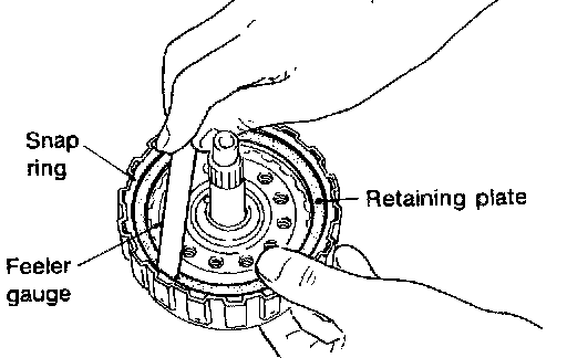 7. Measure clearance between retaining plate and snap ring. If not within allowable limit, select proper retaining plate.