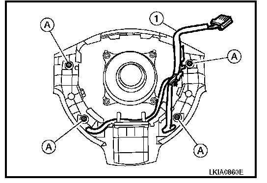 2. Remove the steering wheel audio control switch screws (A) and remove the steering wheel audio control switches (1).
