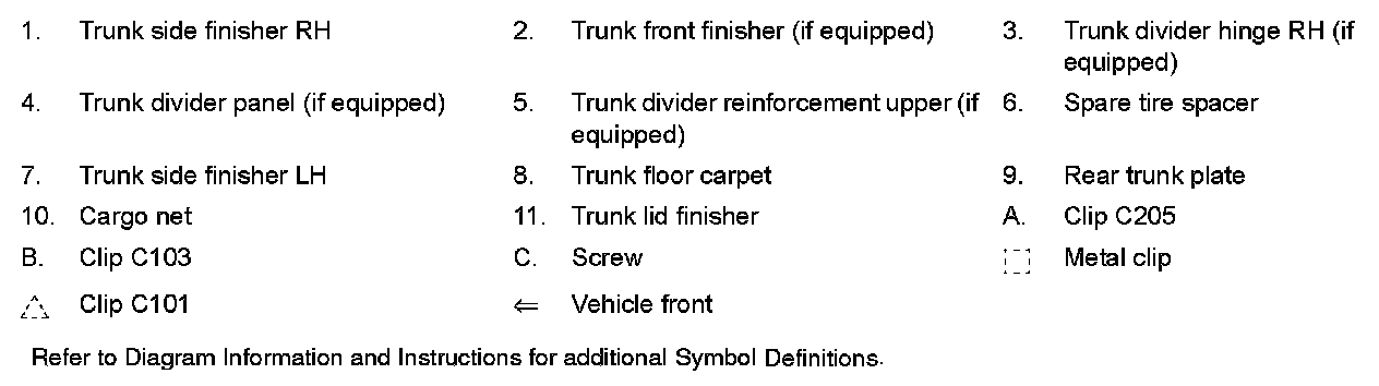 NOTE: If equipped, the trunk divider reinforcement upper MUST first be removed before removing trunk side finisher panels. The trunk divider reinforcement upper MUST also be installed last, if installing trunk side finisher RH/ LH panels.