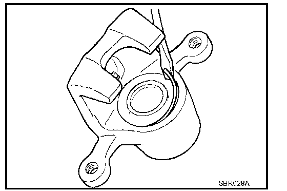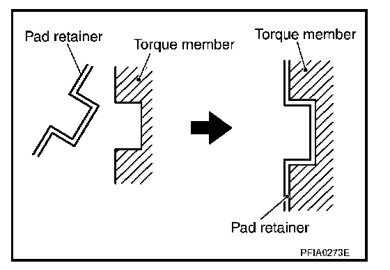 CAUTION: When attaching the pad retainer, attach it firmly so that it does not float up higher than the torque member, as shown in the figure.