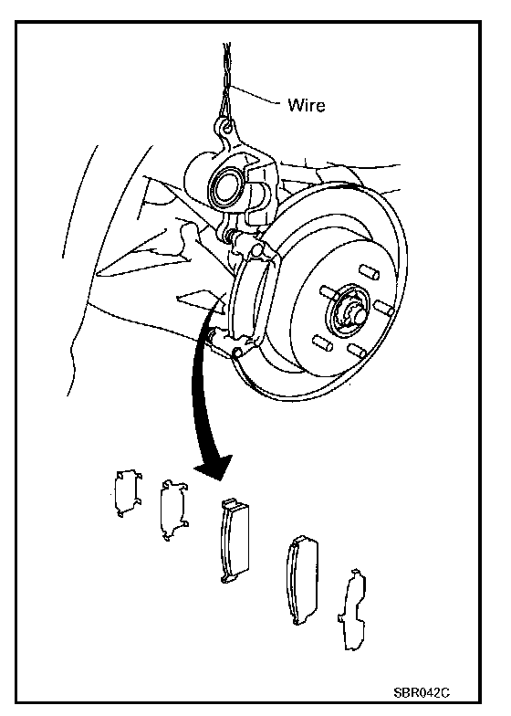 4. Hang cylinder body with a wire, and remove pads, pad retainers, shims from torque member.