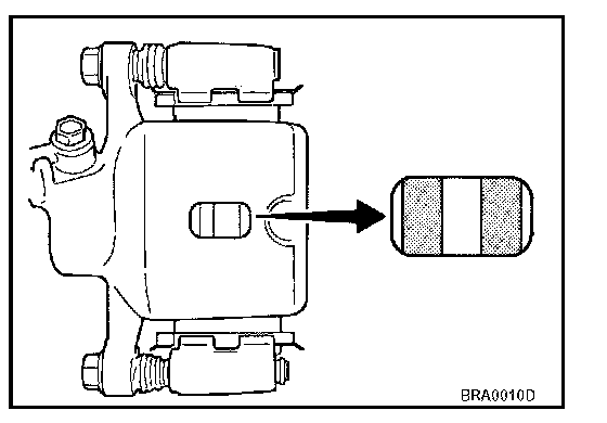 Inspect the thickness of the pad through the caliper inspection hole. Use a ruler or caliper for inspection if necessary.