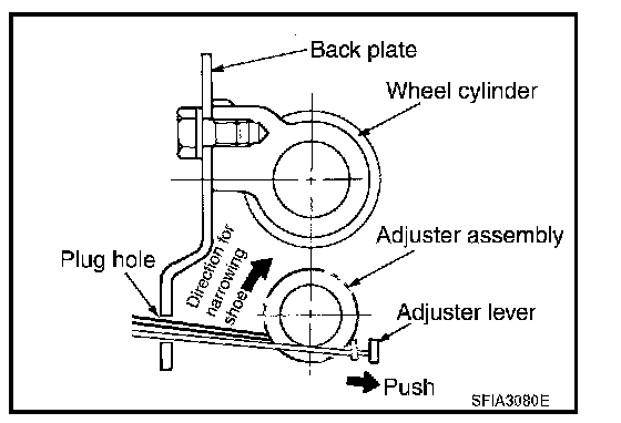 a. Press up adjuster lever with a wire or equivalent from plug hole (plug hole at the side of wheel cylinder) on the back plate as shown in the figure. Turn frame of adjuster assembly with a flat bladed screw driver in the direction that narrows frame to narrow enlarged brake shoe.