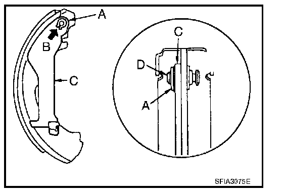 6. Remove retainer ring (A) with a tool to separate operating lever (C) from brake shoe.