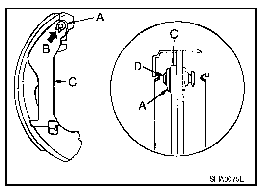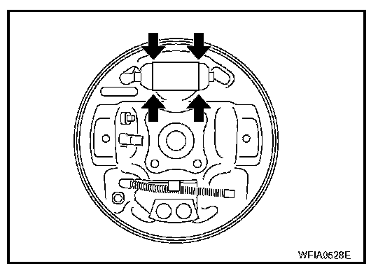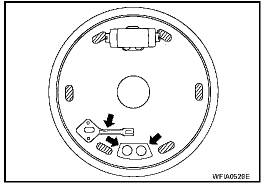 2. Apply NISSAN brake grease (KRF0000005) to brake shoes sliding surfaces (the shaded areas) and other parts on the back plate as indicated by arrows.
