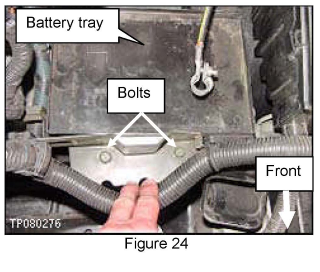 The battery tray is part of the intake duct and is attached at the front and rear.
