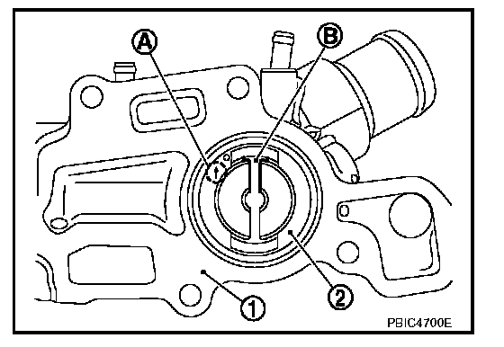 ^ While the mark (A) points to up, install water control valve (2) with frame center (B) facing straight upward into water outlet (1).