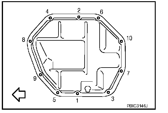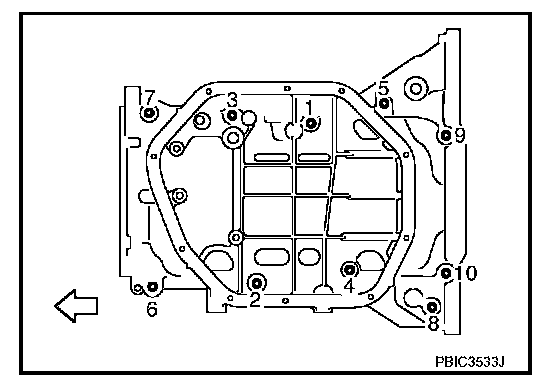 7. Remove oil pan (lower) bolts in reverse order as shown.