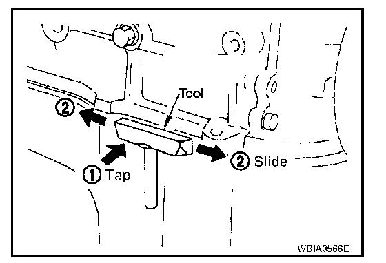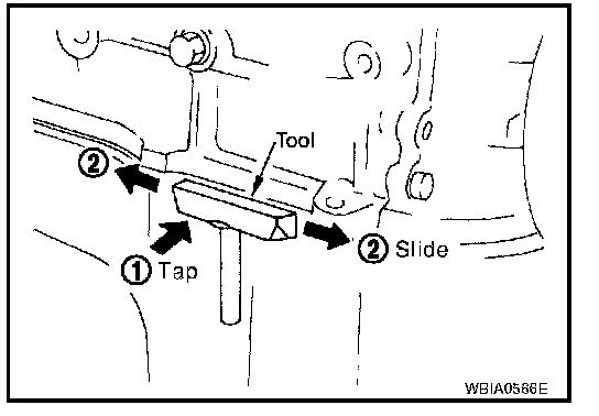 ^ Slide (1) the Tool by tapping (2) its side with a hammer to remove the lower oil pan from the upper oil pan.