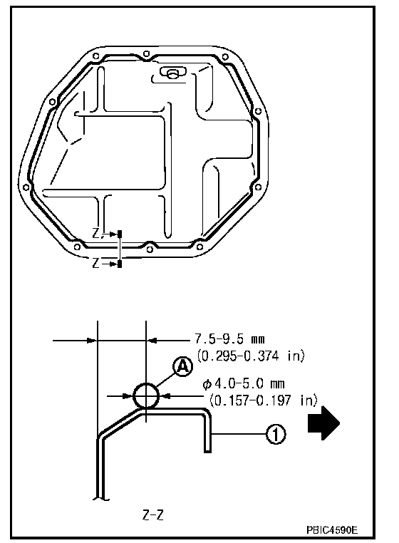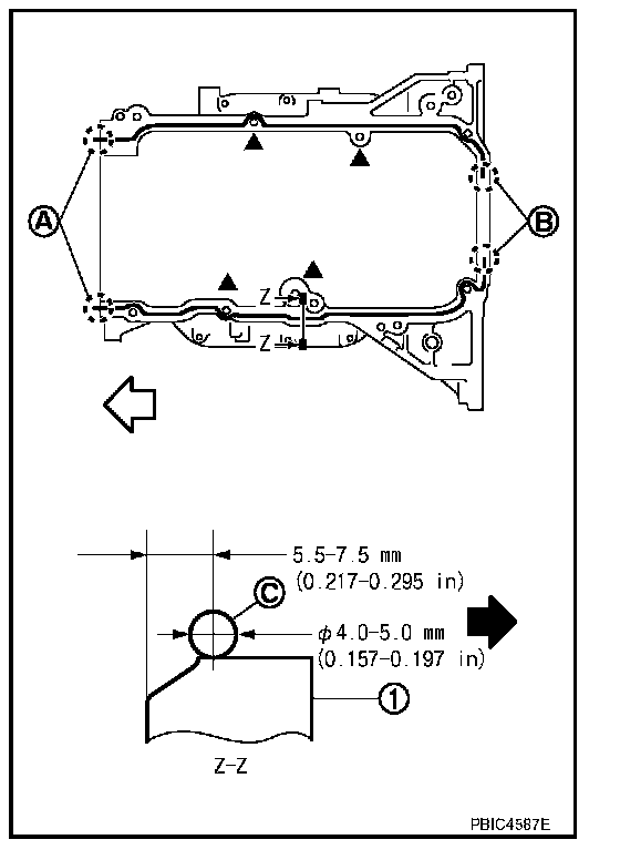9. Apply the sealant without breaks to the specified location using Tool. Use Genuine Silicone RTV Sealant or equivalent. Refer to GI-44, "Recommended Chemical Products and Sealants". Testing and Inspection