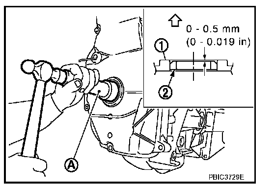 ^ Install front oil seal (2) using a suitable tool with outer diameter 57 mm (2.24 in) and inner diameter 45 mm (1.77 in) (A) to the dimension as shown.