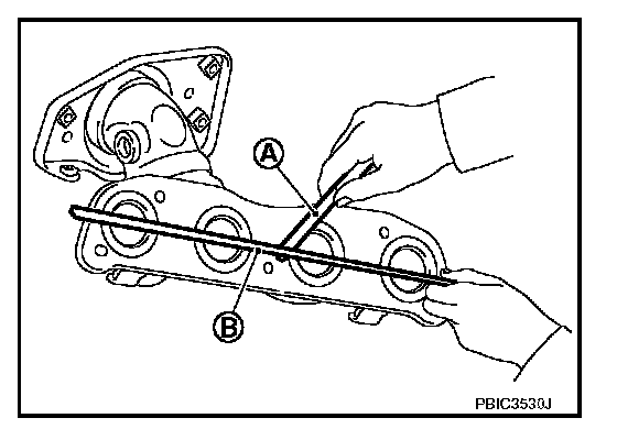 ^ Using straightedge (B) and feeler gauge (A), check the surface distortion of exhaust manifold mating surface in each exhaust port and entire part.