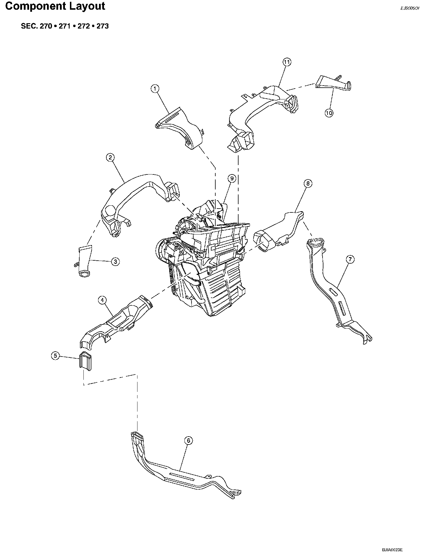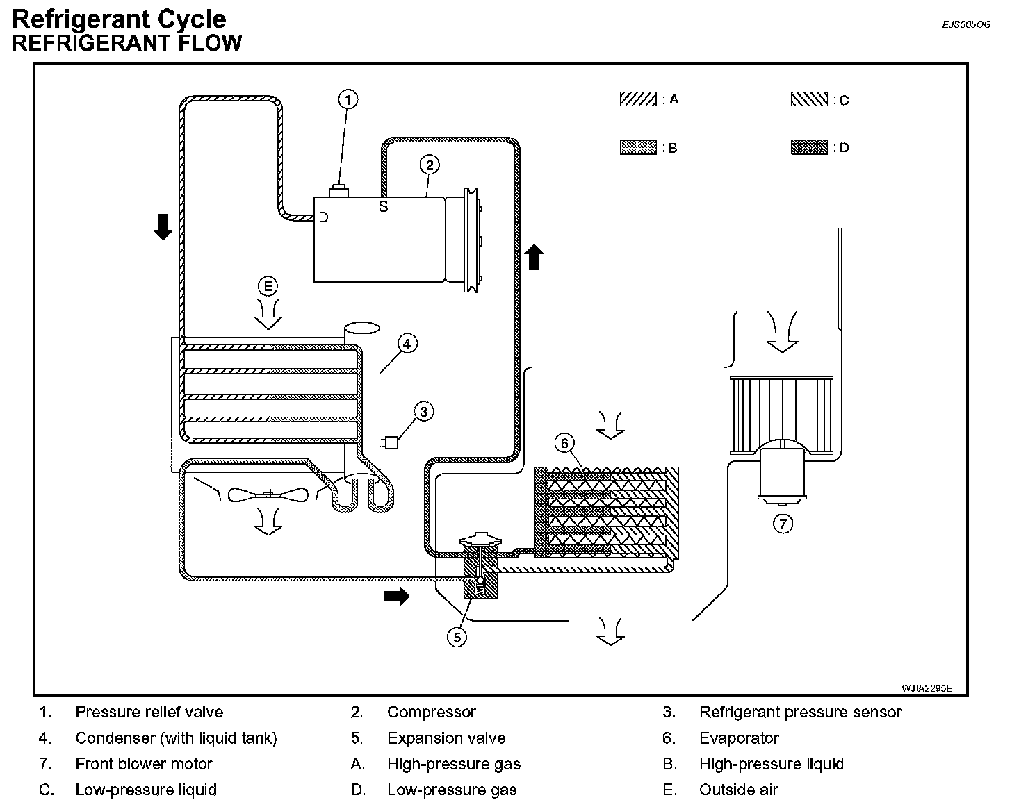 The refrigerant system is protected against excessively high or low pressures by the refrigerant pressure sensor, located on the liquid tank. If the system pressure rises above or falls below the specifications, the refrigerant pressure sensor detects the pressure inside the refrigerant line and sends the voltage signal to the ECM. The ECM then signals the BCM (via CAN communication lines) to cease suppling power to the A/C relay which disengages and stops the compressor. This occurs when pressure on the high pressure side (as detected by refrigerant pressure sensor) is over approximately 2,746 kPa (28 kg/sq.cm , 398 psi), or below approximately 120 kPa (1.22 kg/sq.cm, 17.4 psi).