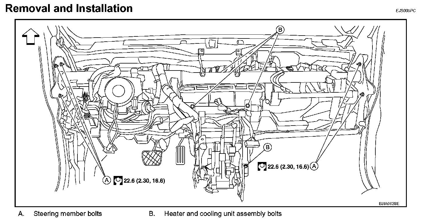 16. Remove the heater and cooling unit and the steering member from the vehicle as one unit.