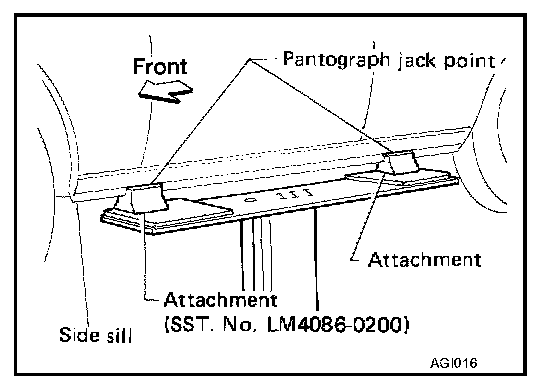 - The board-on lift attachment (LM4086-0200) set at front end of vehicle should be set on the front of the sill under the front door opening.