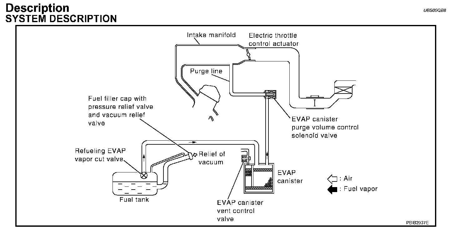 The vapor in the EVAP canister is purged by the air through the purge line to the intake manifold when the engine is operating. EVAP canister purge volume control solenoid valve is controlled by ECM. When the engine operates, the flow rate of vapor controlled by EVAP canister purge volume control solenoid valve is proportionally regulated as the air flow increases.